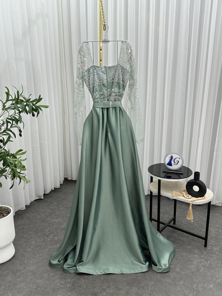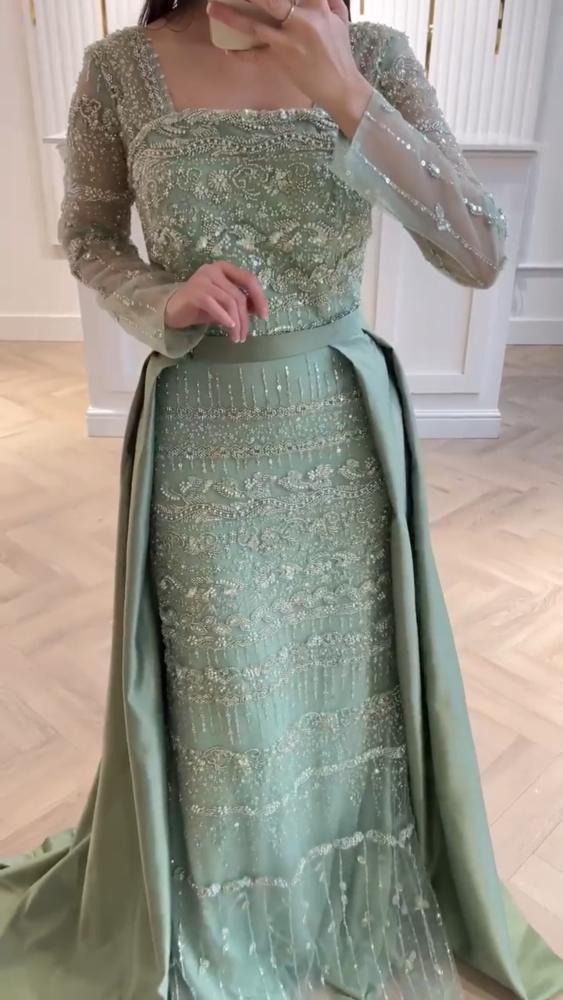 "فستان لويا" أخضر نعناعي خامه القماش تفته حرير على قطعه ترتر ياقة مربعة وأكمام طويلة شفافة مزينة بتطريز خرزي متقن يمتد وشاح أو طبقة خارجية من التفته ملفوفة من الخصر، مما يضفي عليه لمسة ملكية.